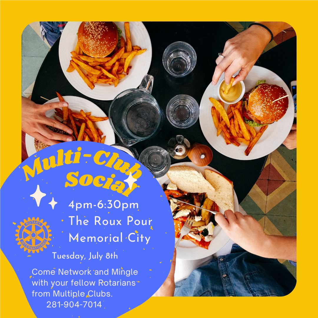 Join us on July 8th, 2025 from 4-7 PM at our multi-Club Social (Happy Hour). Get to know fellow Rotarians from other Clubs. Memorial Spring Branch, Houston International, Galleria Area, Hermann Park, Cypress